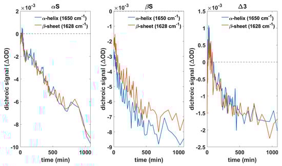 Figure 5. Time-dependent dichroic signals at single wavenumbers representing the orientation of α-helices (1650 cm−1) and β-sheet rich aggregates (1628 cm−1) shown for αS, βS, and Δ3.