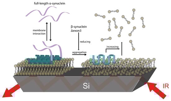 Furthermore, changes in the lipid membrane are observed. It is striking that for αS all bands attributed to the lipids are negative while the water band is positive. For βS, we observe the opposite. As the strength of the evanescent field decays exponentially with the distance to the surface of the IRE, negative bands indicate reduced absorption, which can often be attributed to molecules getting further away from the crystal surface. Positive bands, on the other hand, can be interpreted as molecules getting closer to the IRE. This leads to the conclusion that upon interaction of αS with an SSLB, lipid molecules are removed from the IRE surface. The latter is interpreted as membrane damage. In contrast, the lack of absorption at 1628 cm−1 and the fact that there are no negative lipid bands in the spectra for βS indicate that there is neither aggregation nor perturbation of the lipid membrane. This is in line with previous studies that assume that aggregation of αS is causing deleterious effects on the cell membrane in Parkinson’s disease [8,9,10] and with studies that propose a protective effect of βS [48,49,50,51,52,53].