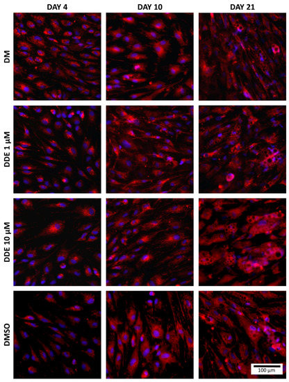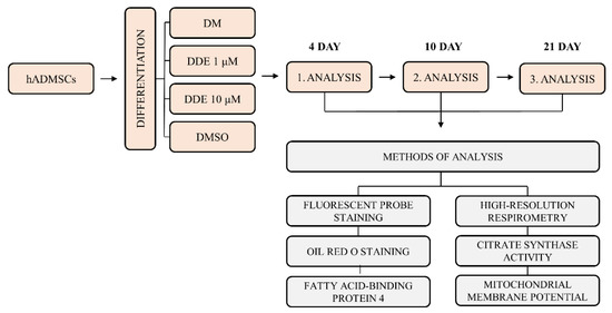 After reaching 80% confluence, the culture medium was changed to four different differentiation media: (A) pure differentiation medium (DM); (B) differentiation medium with dimethyl sulfoxide (DMSO); (C) differentiation medium with DMSO and p,p´-DDE, in final concentration 1 μM (DDE 1 μM); (D) differentiation medium with DMSO and p,p´-DDE in final concentration 10 μM (DDE 10 μM). The pure differentiation medium contained StemPro® Adipogenesis Differentiation Basal Medium with StemPro® Adipogenesis Supplement and 1% gentamicin (all Thermo Fisher Scientific, Carlsbad, CA, USA). DDE concentrations 1 μM and 10 μM were chosen because of their most common use in in vitro studies. DMSO, which is commonly used as a solvent of lipophilic compounds for in vitro cell experiments, is generally considered nontoxic up to 0.05% concentration (v/v) [18]; however, some studies suggest that this solvent can even promote proliferation at least in some cell lines [25]. On that account, we first compared the differentiation process under DM alone with the differentiation medium with DMSO in concentration used in our experiments, i.e., 0.019%. We have found that the addition of DMSO affected the process of differentiation, since the cell count per well measured using NucBlueTM Live ReadyProbesTM Reagent (Thermo Fisher Scientific, Carlsbad, CA, USA) as described below displayed a slightly different pattern in the course of adipogenesis. Thus, all our results acquired from DDE-exposed cell cultures were compared separately to the cells differentiating in the same medium with or without DMSO. A summary scheme of the experiment is shown in Figure 1.