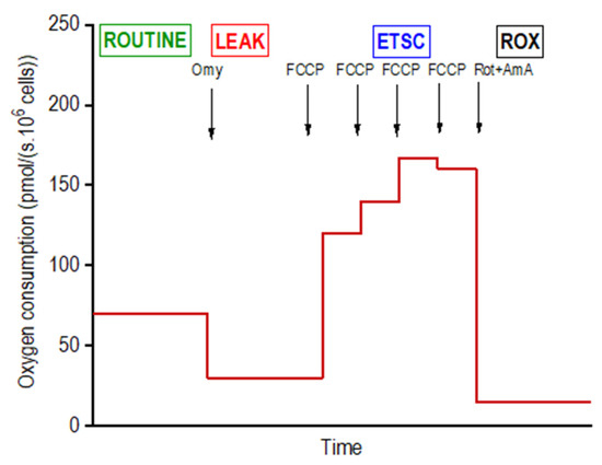 Mitochondrial respiration of intact adipocytes on days 4 (n = 6 per group; i.e., DM, DMSO, DDE 1 µM, DDE 10 µM), 10 (n = 6) and 21 (n = 6) of differentiation was analyzed in the StemPro® Adipogenesis Differentiation medium using high-resolution respirometry in a 2-chamber oxygraph O2k (Oroboros Instruments, Innsbruck, Austria). The negative time derivative of the oxygen concentration in the chamber was calculated online to determine oxygen consumption (DatLab software, version 7.3.0.3, Oroboros, Austria). The cells were applied into the open precalibrated oxygraph chambers, stirred at 350 rpm and a sample of 15 µL of the cell suspension was aspirated to count the cells in the Bürker hemocytometer. After closing the oxygraph chambers, a substrate-uncoupler-inhibitor titration (SUIT) protocol for intact cells was used to determine the standard respiratory states: ROUTINE (ROUT; R)—oxygen consumption at the physiological coupled state; LEAK (L; injection of 2.5 µmol/L oligomycin)—non-phosphorylating resting state of respiration to compensate for the proton leak when ATP synthase is not active; the electron-transfer-system capacity (ETSC; E) was assessed after titrations of trifluorocarbonylcyanide phenylhydrazone (FCCP; 0.05 µmol/L titration steps) to reach maximal oxygen consumption in the noncoupled state; and ROX, residual oxygen consumption indicating oxidative side reactions remaining after inhibition of the electron transfer pathway (0.5 μmol/L rotenone and 2.5 µmol/L antimycin A) [21]. Oxygen consumption was expressed in pmoL O2/(s · 106 cells) and corrected to ROX and instrumental background. The representative scheme of the experiment on intact cells is shown in Figure 2.