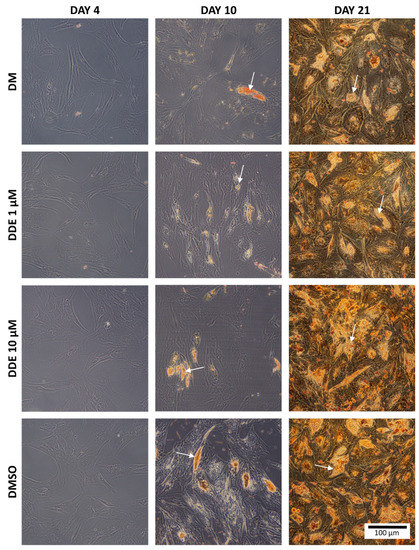 Summary scheme of the experiment.DM: pure differentiation medium; DDE 1 μM: differentiation medium with added p,p´-DDE, which was dissolved in dimethyl sulfoxide (DMSO); DDE 10 μM: differentiation medium with added p,p´-DDE, which was dissolved in DMSO; DMSO: differentiation medium (DM) with DMSO only.