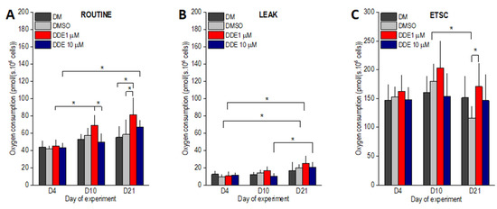 (A–C) ROUTINE, LEAK and uncoupled (ETSC) oxygen consumptions of adipocytes differentiating in media containing no additive (DM) or DMSO, DMSO and 1 µM p,p’-DDE, and DMSO and 10 µM p,p’-DDE on days 4, 10, and 21 of the experiment. Significant differences * p < 0.05 (Two-way ANOVA followed by a post-hoc Tukey test).