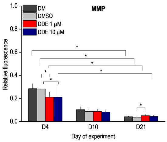 Mitochondrial membrane potential (MMP) during adipocyte differentiation in media containing no additive (DM) or DMSO, DMSO, and 1 µM p,p’-DDE, and DMSO and 10 µM p,p’-DDE on days 4, 10, and 21 of the experiment. Significant differences * p < 0.05 (Friedman and Wilcoxon rank sum tests). On the fourth day of differentiation, a significant decrease in MMP was observed in DDE-affected cells at both 1 μM and 10 μM concentrations compared to medium containing DMSO alone. In cells affected with 1 μM DDE, there was a significant increase in MMP on day 21 of differentiation compared to control cells exposed to DMSO alone.
