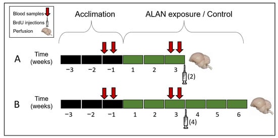 A schematic description of the experimental design. (A) Timeline of the cell proliferation experiment. (B) Timeline for the neuronal recruitment experiment. Red arrows indicate blood sampling; syringes indicate BrdU treatment times; and the numbers in brackets indicate the number of injections. See text for details.