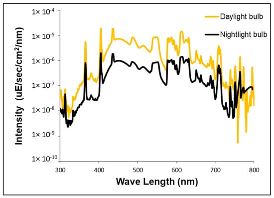 The spectrum and intensity of each light source that was used in the experiment for day and night-time illumination.