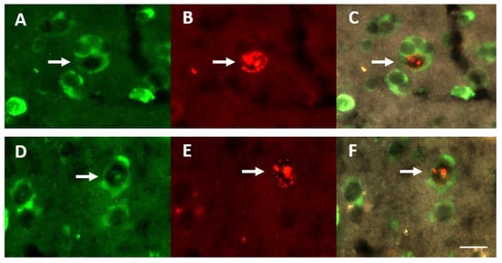 To study the effect of exposure to ALAN on NR in the brain, all birds from the NR experiment were treated with four injections of BrdU, administrated within a 48 h period, two in the mornings and two in the afternoons, at three weeks of ALAN exposure. Birds were killed three weeks after the last injection. This protocol enabled labelling of new neurons within several brain regions (see below). Histology and immunohistochemistry for the NR experiment were performed as described in [,]. This staining protocol yielded neurons that were stained fluorescent green (with anti-Huc/HuD), and nuclei of new neurons that were stained fluorescent red (with anti-BrdU) (Figure 3). Therefore, cells with colocalization of green cytoplasm and red fluorescent nuclei were identified as new neurons. Accordingly, we could record the location of BrdU+ neurons and count them in each section, as explained below.