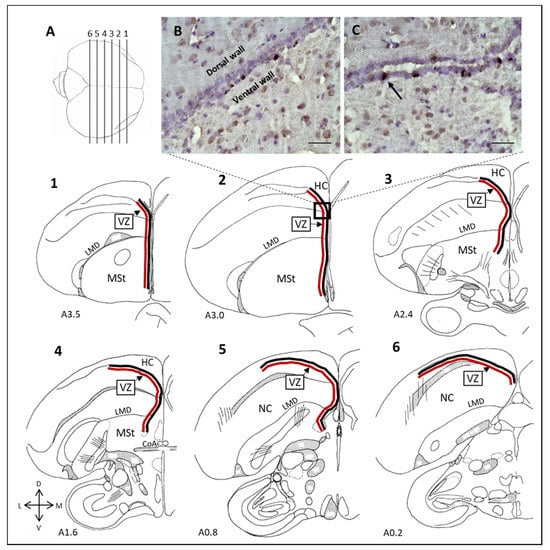 Mapping of cell proliferation in the ventricular zone (VZ). (A) Top view of a zebra finch brain (caudal is to the left, rostral is to the right). The numbered lines indicate the locations of the mapped sections, and frontal schematic illustrations of these sections are shown in 1–6 (taken from the atlas of the canary brain []). Red lines indicate the ventral walls of the VZ in each mapped section and the black lines indicate the dorsal walls. (B,C) Pictures showing two different small parts of the two walls of the VZ, to demonstrate new-born cells labelled with BrdU and stained dark brown (only one of the labelled cells is marked by an arrow). CoA, anterior commissure; HC, hippocampus; LMD, lamina medullaris dorsallis; MSt, medial striatum; NC, nidopallium caudale. Scale bar = 20 μm. (Adapted with permission from Ref. []. Copyright 2021, JOHN WILEY & SONS, INC.).