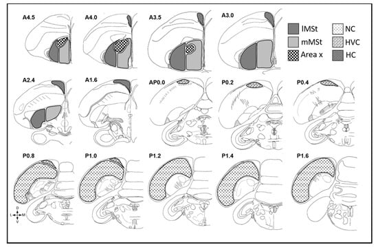 Mapping of new neuronal recruitment in several brain regions are shown. Illustrations of the mapped sections of medial striatum (MSt), nidopallium caudale (NC), hippocampus (HC), HVC and Area X are adapted with permission from Ref. []. Copyright 2021, Elsevier. Five sections of the lateral MSt (lMSt) and medial MSt (mMSt) (A4.5—A2.4), five sections of the NC (P0.8—P1.6), five sections of the HC (A4.0—A1.6), five sections of the HVC (AP0.0—P1.0) and three sections of Area X (A4.5—A3.5) are highlighted.