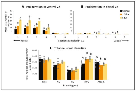Cell proliferation (number of cells/mm; mean ± SE) in ventral (A) and dorsal (B) walls of the VZ, in brains of birds exposed to ALAN (1.5 and 5 lux) and controls that were exposed to complete darkness at night. Six sections were sampled along the rostral-caudal axis of the VZ (for details see Figure 4). Total neuronal densities (number of neurons/mm3; mean ± SE; (C)) in the brain regions MSt (medial striatum), NC (nidopallium caudale), HC (hippocampus), HVC, and Area X, of birds exposed to 1.5- and 5 lux ALAN, and controls that were exposed to complete darkness at night. Grey dots indicate individual data points, different letters indicate significant differences (Tukey post hoc tests, following one-way ANOVAs within each section). n = 6 birds per group. When no letters are mentioned, there is no difference among groups.