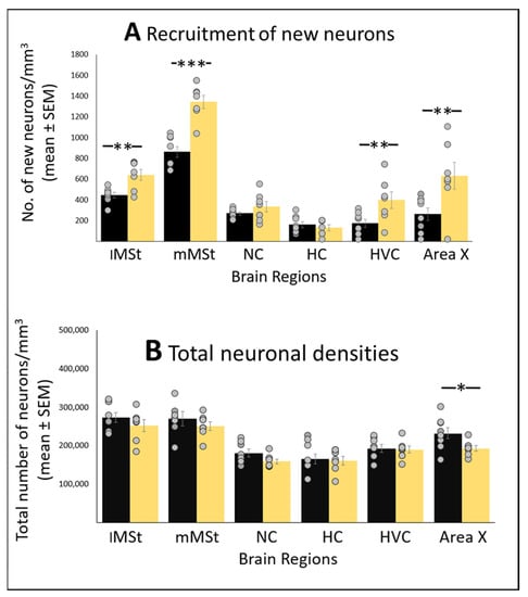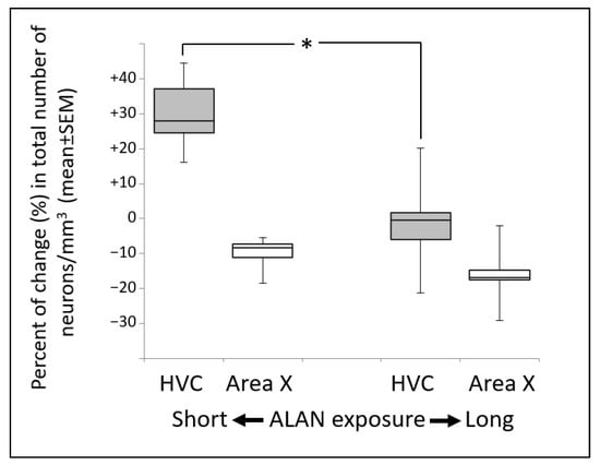 3.4. ALAN Decreases Total Neuronal Densities But Only in Area X after Long Term Exposure