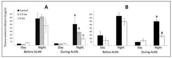 Diurnal and nocturnal MEL plasma concentrations before and during ALAN exposures are presented in Figure 9. Overall, as expected, diurnal MEL levels were lower than the nocturnal ones in both the CP and the NR experiments (F(2,14) = 151.557, p = 0.0091, and F(1,20) = 216.557, p = 0.0042, respectively). Similarly, in each experiment, before ALAN exposure, when all groups experienced complete dark nights, nocturnal MEL levels were similar across groups. However, in both experiments, when the experimental groups were exposed to ALAN, nocturnal MEL levels were reduced compared to the controls (F(2,20) = 2.618, p = 0.0111 in the CP experiment, Figure 9A; and F(1,14) = 3.425, p = 0.0223 in the NR experiment; Figure 9B).