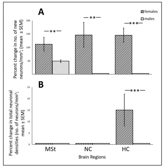 (A) Percent change in neuronal recruitment (number of new neurons/mm3; mean ± SE) compared to corresponding control, and (B) percent change in total neuronal densities (number of neurons/mm3 ± SE), in MSt, NC and HC, in brains of female and male zebra finches exposed to 5 lux ALAN for 6 weeks. Female data adapted from Ref. []. N = 8 for each sex. **, ***—indicate significant differences (p < 0.005, and p < 0.0005 respectively; Tukey post hoc tests following one-way ANOVAs for each section separately).