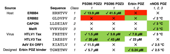 The PDZ domains and the ligands used in this study. The ligands are grouped by their sources (host, virus or design) and are noted with both their respective names and amino acid sequences. The color fill means that the interaction has been previously described (green), or has also been demonstrated not to occur (red). If there is no fill, the interaction has not been studied according to bibliography, to the best of our knowledge (the references for the described interactions are in the text). The tick (✓) and the cross (✕) signs mean whether there is interaction or not, respectively, as demonstrated in this study. We have included the Kd in μM or the ΔTm in °C, whenever an interaction has been shown by ITC or DSC, respectively (see Section 3.2 and Section 3.3 for details).