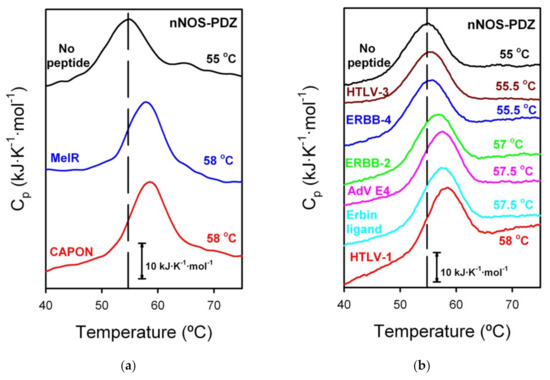 With those binding experiments that did not reveal an interaction by ITC, we decided to test them with DSC, both with and without the ligands, in the same buffer conditions. The final ratio of PDZ:peptide was always 1:3. DSC is also a calorimetric technique but that allows finding a more subtle binding, weaker than that from ITC [33]. Undoubtedly, ITC presents greater advantages, since it gives an exhaustive characterization of the binding interaction, granting the whole thermodynamics of the system; nevertheless, if the interactions are out of the ITC range, usually when they are weak (Kd values in the mM range), it is not sensitive enough to detect binding. By contrast, DSC can detect weak binding by a displacement of the melting temperature (Tm) due to the stabilization that occurs upon binding. Essentially, when a ligand is bound to the protein, energy is needed to decouple the interacting pair before protein denaturalization. In this way, the Tm is increased and the ΔTm is proportional to the interaction energy.