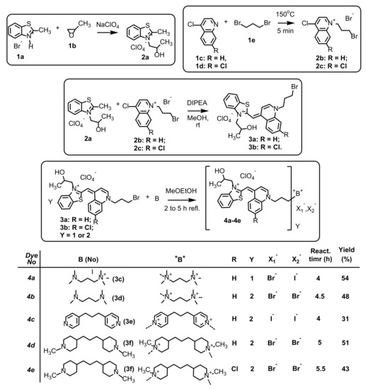 - Deligeorgiev, T.; Gadjev, N.; Vasilev, A.; Drexhage, K.H.; Yarmoluk, S.M. Synthesis of novel monomeric and homodimeric cyanine dyes with thioacetyl substituents for nucleic acid detection. Dye. Pigment. 2007, 72, 28–32. [Google Scholar] [CrossRef]