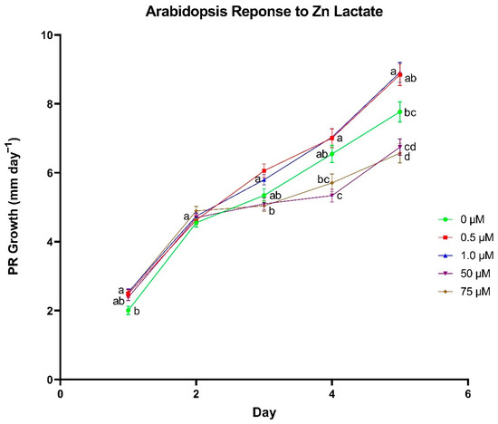 The effect of zinc (Zn) lactate concentration on primary root (PR) growth rate in Arabidopsis thaliana. Differences between means were compared using Tukey’s Honest Significant Difference test, where different letters indicate a statistically significant difference between treatment concentrations in their respective day of growth. Error bars denote means ± SE (n = 53–78).