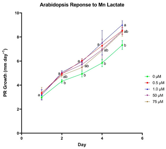 The effect of manganese (Mn) lactate concentration on primary root (PR) growth rate in Arabidopsis thaliana. Differences between means were compared using Tukey’s Honest Significant Difference test, where different letters indicate a statistically significant difference between treatment concentrations in their respective day of growth. Error bars denote means ± SE (n = 51–63).