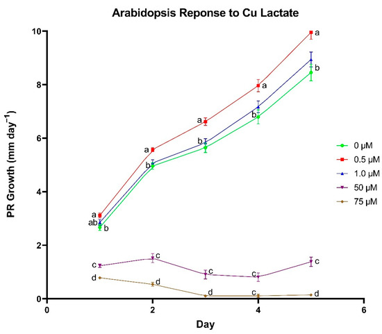 The effect of copper (Cu) lactate concentration on primary root (PR) growth rate in Arabidopsis thaliana. Differences between means were compared using Tukey’s Honest Significant Difference test, where different letters indicate a statistically significant difference between treatment concentrations in their respective day of growth. Error bars denote means ± SE (n = 60–82).