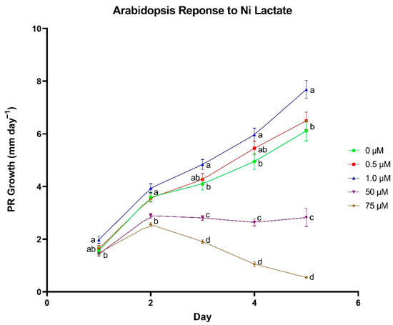 The effect of nickel (Ni) lactate concentration on primary root (PR) growth rate in Arabidopsis thaliana. Differences between means were compared using Tukey’s Honest Significant Difference test, where different letters indicate a statistically significant difference between treatment concentrations in their respective day of growth. Error bars denote means ± SE (n = 34–95).