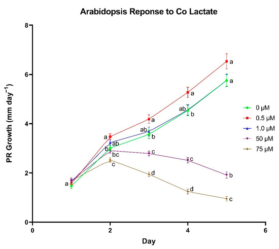The effect of cobalt (Co) lactate concentration on primary root (PR) growth rate in Arabidopsis thaliana. Differences between means were compared using Tukey’s Honest Significant Difference test, where different letters indicate a statistically significant difference between treatment concentrations in their respective day of growth. Error bars show means ± SE (n = 40–74).
