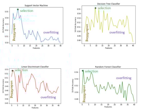 The proposed feature selection philosophy using various classifiers is explained in the Figure 2 where the x-axis represents the number of features(4005) and the y-axis represents the 10-fold accuracy. We have employed various classifiers to check the validity of our feature selection approach so that the robustness of our feature selection approach be emphasized. It can be observed using Figure 2. Initially, the accuracy is low because of the lesser number of features then the accuracy increases for the classifiers until it reached the maximum level and from there it again starts to decrease. In the following three sections we will explain the reasons for having such a phenomena in the case for all the classifiers.