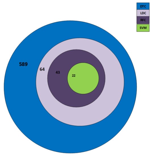 As can be observed in Figure 3, those features corresponding to the SVM classifiers are the smallest and those corresponding to the decision tree classifiers are the largest.
