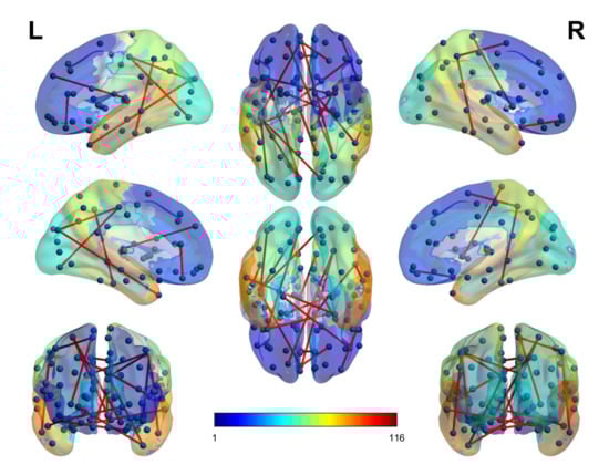 - Xia, M.; Wang, J.; He, Y. BrainNet Viewer: A network visualization tool for human brain connectomics. PLoS ONE 2013, 8, e68910. [Google Scholar] [CrossRef] [PubMed] [Green Version]