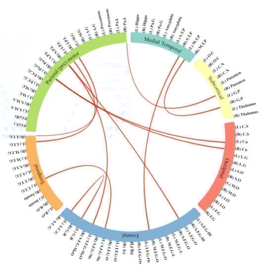 - Tzourio-Mazoyer, N.; Landeau, B.; Papathanassiou, D.; Crivello, F.; Etard, O.; Delcroix, N.; Mazoyer, B.; Joliot, M. Automated anatomical labeling of activations in SPM using a macroscopic anatomical parcellation of the MNI MRI single-subject brain. NeuroImage 2002, 15, 273–289. [Google Scholar] [CrossRef]