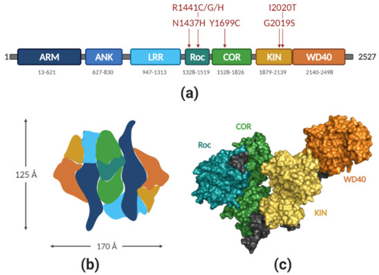 - Deng, J.; Lewis, P.A.; Greggio, E.; Sluch, E.; Beilina, A.; Cookson, M.R. Structure of the ROC domain from the Parkinson’s disease-associated leucine-rich repeat kinase 2 reveals a dimeric GTPase. Proc. Natl. Acad. Sci. USA 2008, 105, 1499–1504. [Google Scholar] [CrossRef] [Green Version]