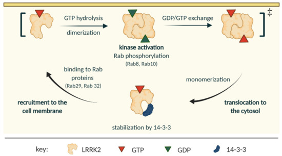 - Taymans, J.-M.; Vancraenenbroeck, R.; Ollikainen, P.; Beilina, A.; Lobbestael, E.; De Maeyer, M.; Baekelandt, V.; Cookson, M.R. LRRK2 Kinase Activity Is Dependent on LRRK2 GTP Binding Capacity but Independent of LRRK2 GTP Binding. PLoS ONE 2011, 6, e23207. [Google Scholar] [CrossRef] [PubMed] [Green Version]