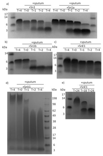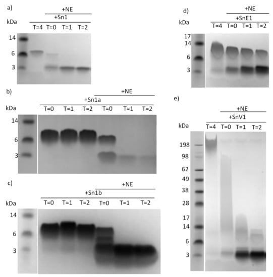 SDS-PAGE gels of peptides incubated with NE. An aliquot of 500 μg/mL of (a) Sn1, (b) Sn1a, (c) Sn1b, (d) SnE1 or (e) SnV1 was incubated with 500 nM of neutrophil elastase for 0–4 h. Samples were electrophoresed and stained with Coomassie stain.