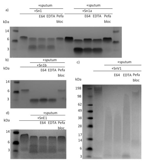 In this study, the snake-derived AMPs Sn1, Sn1a, Sn1b, SnE1 and SnV1 were suspected to be susceptible to cleavage by lung relevant proteases, most notably, NE. This suspicion was confirmed by SDS-PAGE of peptide-sputum incubation samples. Further incubation with CF sputum in the presence/absence of serine, cysteine and MMP protease inhibitors highlighted that serine proteases were the major hydrolytic enzymes responsible for the observed degradation (Figure 2).