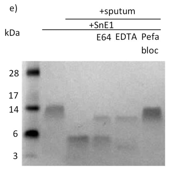 SDS-PAGE gels of peptides incubated with CF sputum in the presence/absence of protease inhibitors. An aliquot of 500 μg/mL of (a) Sn1, Sn1a, (b) Sn1b (c) SnV1, or (d) SnE1 was incubated with CF sputum in the presence/absence of E64 (cysteine protease inhibitor), EDTA (MMP inhibitor) or pefabloc (serine protease inhibitor) for 4 h. An aliquot of 500 μg/mL of (e) SnE1 was also incubated with CF sputum and inhibitors for 24 h. The samples underwent electrophoresis and stained with Coomassie stain to allow visualisation.