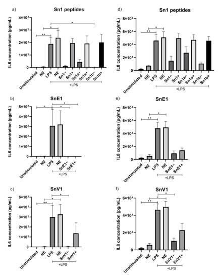 Only SnV1 incubated in the absence of NE prior to cell stimulation resulted in a statistically significant decrease in LPS-induced IL-8 level (Figure 4f). The other NE-incubated peptides had no statistically significant effect on LPS-induced IL-8 release by THP-1 cells, but NE-incubated and non-NE-incubated SnE1 generated trends toward reduced IL-8 (Figure 4d,e).
