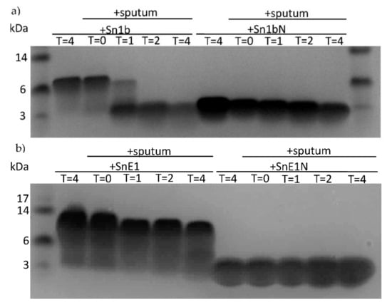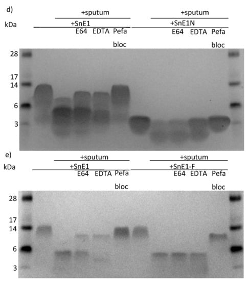 When directly compared to respective parent peptides in CF sputum incubations, two derivatives were found to be susceptible to degradation by sputum proteases (Figure 6). Incubation of Sn1bN with CF sputum did not result in obvious degradation under the test conditions, whereas cleavage of Sn1b was clearly evident, suggesting Sn1bN may be more stable in the presence of lung proteases compared to parent Sn1b (Figure 6a). As the degradation of SnE1 and derivatives was not obvious following incubation with sputum for 4 h, the incubation time of these peptides was increased to 24 h (Figure 6b,c). SnE1, SnE1N and SnE1-F exhibited transition from one band of higher molecular weight to one of lower molecular weight after incubation with sputum for 24 h indicative of degradation by proteases (Figure 6d).