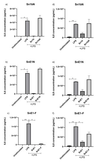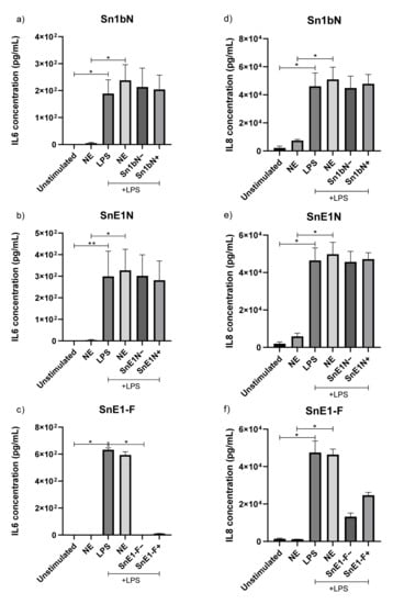Sn1bN and SnE1N had no effect on LPS-induced IL-6 or IL-8 levels, regardless of NE incubation status (Figure 10a,b,d,e). Only SnE1-F incubated in the absence of NE prior to cell stimulation significantly reduced LPS-induced IL-6 levels (Figure 10c).