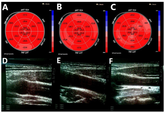 Figure 2. Left ventricular global longitudinal strain (GLS) in (A) a healthy subject, (B) women with exclusively type 1 diabetes mellitus (T1DM), (C) women with T1DM and Hashimoto’s disease (HD); and ultrasound images of carotid intima-media thickness (cIMT) measurement in (D) a healthy subject, (E) women with exclusively T1DM, and (F) women with T1DM and HD.