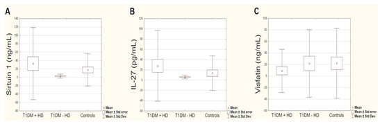 Figure 3. (A) Sirtuin 1 serum levels, (B) IL-27 serum levels, and (C) visfatin serum levels for each sample group in the study population.