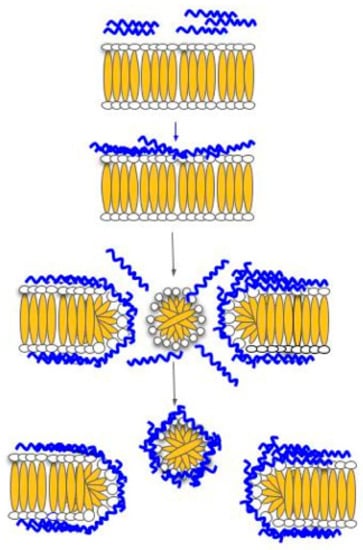 In the barrel and stave model (Figure 3), transmembrane channels are formed from the collection of monomer peptides on the cell membrane; the monomer peptides undergo a structural change and aggregate together to form the ‘stave’ within the membrane bilayer. The insertion process is the result of the aggregation, which forces the peptides into the lipid core region; the insertion of the peptide creates a hydrophilic channel that blocks off the hydrophobic part of the bilayer. Once the channel has formed, more monomers will be accumulated to further increase the channel’s size. In addition, the cell membrane is also weakened due to the hydrophobic forces exerted by the peptide. At the moment, the only known ACP that employs this mechanism is alamethicin [].