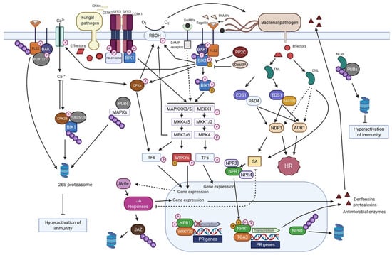 Phosphorylation is paramount in several aspects of immunity to control enzyme activity and in signalling. Phosphorylation is crucial in PRR downstream responses through phosphorylation cascades; phosphorylation is a rapid and transient switch (Figure 2) and is essential in immune signal transduction [42]. Ligand perception in several PRRs stimulates the recruitment of coreceptor BRI1-ASSOCIATED RECEPTOR KINASE (BAK1) (also known as SOMATIC EMBRYOGENESIS RECEPTOR KINASE 3 (SERK3)), which heterodimerises with several receptor-like-kinases (RLKs) including FLS2, BRASSINOSTEROID INSENSITIVE-1 (BRI1), and EFR [45]. BAK1 is differentially phosphorylated when in complex with different PRR complexes [46]. BOTRYTIS-INDUCED KINASE 1 (BIK1) is a substrate of BAK1 and the pair feature in many defence signalling pathways. Autophosphorylation and transphosphorylation are essential by both BIK1 and BAK1 in their interaction and interaction with other downstream components in signal transmission [45]. BIK1 dissociation activates downstream signalling, such as activation of MAPK cascades, transcriptional reprogramming, and ROS production [47,48]. BIK1 directly phosphorylates respiratory burst oxidase homologue protein D (RbohD), an NADPH oxidase which produces ROS burst to induce stomatal closure and act as antimicrobial molecules [49,50].