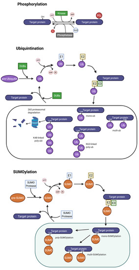 Post-translational modification pathways. Phosphorylation is the process catalysed by protein kinases in which a phosphate group (PO4) is transferred from ATP onto the side-chain hydroxyl groups on serine, threonine, or tyrosine residues on a target protein. Phosphatases hydrolyse the phosphoester bond to remove the phosphate group. Ubiquitination involved the sequential action of the ubiquitin-activating enzymes (E1), ubiquitin-conjugating enzymes (E2), and ubiquitin-protein ligases (E3) to covalently attach ubiquitin onto the target lysine. Different ubiquitin attachment linkages and chain lengths have different functions; for example, K48-linked tetraubiquitin targets the protein for 26S proteasomal degradation. Deubiquitinating enzymes (DUBs) catalyse deubiquitination. SUMOylation is analogous to ubiquitination and involves the sequential action of SUMO E1, E2, E3 enzymes to covalently attach SUMO onto the target lysine. SUMO is synthesised as an inactive precursor which has its C-terminal peptide cleaved by a SUMO protease exposing the di-glycine motif. SUMO proteases also catalyse the removal of SUMO.