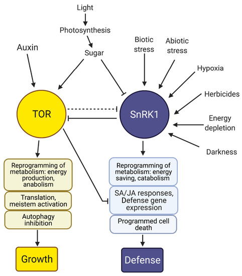 SnRK1 and TOR (target of ramamycin) are energy sensors, act as global master regulators of metabolism, and play a dynamic and important role in the growth–defence balance [199,200]. SnRK1 and TOR are key in responding to biotic stress for plant survival (Figure 3) [201]. SnRK1 and TOR are protein kinase complexes which largely work antagonistically, and their crosstalk is evolutionarily conserved [198,202]. Typically TOR is activated in nutrient-rich conditions and promotes growth [203]. SnRK1, SnRK2, and SnRK3 subfamilies all have roles in promoting defence [204], but SnRK1 is the most prominent in the global regulation of metabolism in response to energy status [205]. SnRK1 is activated in response to energy depletion often occurring in stress conditions to restore energy homeostasis [206,207,208,209,210,211] (Figure 3).