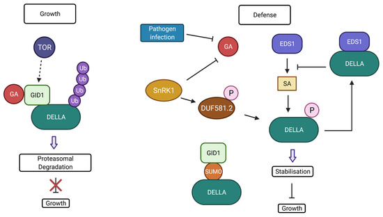 Downstream of SnRK1, via the domain of the unknown function (DUF)581-2, two DELLA proteins, gibberellic-acid insensitive (GAI) and RGA, were shown to be stabilised (Figure 4) [242]. DELLAs are suppressors of growth and act to suppress GA-responsive genes and GA biosynthetic genes and promote negative GA signalling components to maintain GA homeostasis [243]. Arabidopsis contains five DELLA protein genes (RGA, GAI, RGA-Like1 (RGL1), RGL2, and RGL3) which have some overlapping functions in repressing GA responses [242]. Stress signals inhibit the degradation by GA, including PAMP elicitor flg22 [244]. DELLAs are regulatory signalling hubs which integrate environmental signals and are regulated mostly at the post-translational level with SUMOylation, ubiquitination, and phosphorylation as critical PTMs of DELLAs (Figure 4) [245,246,247]. GA, a growth-promoting phytohormone, relieves the DELLA-mediated repression of genes through binding of GA to its receptor GID1 which triggers ubiquitination and proteasomal degradation of DELLAs [248,249,250,251,252,253,254].