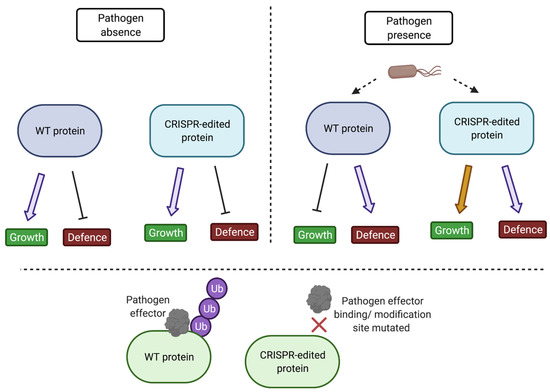 Crop selection is based on yield-related traits; the diversity of disease resistance genes in most crop plants today has been reduced as a consequence [302]. NLR genes have been used widely but are often not durable as a result of pathogen evolution. The pyramiding of NLR genes can be a solution to durability but can cause reduced growth and yield in the absence of pathogen infection [296]. NLR gene introduction can lead to excessive HR response, inappropriate activation of defence genes, or regulation of ROS [65,303,304,305]. There needs to be more research into durable disease resistance without compromising yield. Several potential advances need testing in the future. Genome editing, specifically the clustered regularly interspaced short palindromic repeats/CRISPR-associated protein (CRISPR/Cas) system, has the ability to generate knockouts of, for example, “susceptibility genes”; however, this can have detrimental effects if a protein is multifunctional [306]. The use of CRISPR/Cas and knowledge of PTMs enable the change in critical effector interaction residues of pathogen targets to prevent pathogen PTM attachment and methods of pathogenicity (Figure 5).