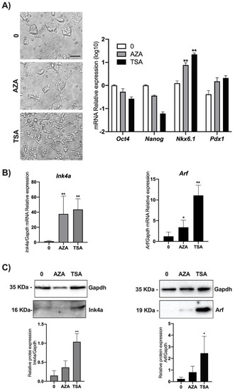 3.1. Ink4a/Arf Gene Expression Increases in mESCs Induced to Differentiate towards Pancreatic Lineage