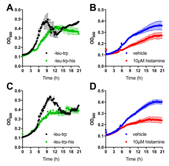 Interaction between H4R with TSPAN4 and CD63 as measured by MYTH liquid growth assay. (A) Co-expression of the H4R-Cub-LexA-VP16 and NubG-TSPAN4 constructs is evidenced by growth in media without leucine and tryptophane (black trace, selecting for diploids). Two-hybrid interaction and subsequent expression of the HIS3 reporter gene results in growth on media additionally depleted for histidine (green trace, selecting for a two-hybrid interaction). (B) Modulation histidine-independent growth of the H4R-Cub-LexA-VP16 and NubG-TSPAN4 expression diploid by vehicle (blue trace) or 10 µM histamine (red trace). (C) Interaction between H4R-Cub-LexA-VP16 and NubG-CD63 as describe in (A). (D) Modulation of the interaction between H4R (bait) and CD63 (prey) as described in (B). Data are displayed as mean ± SEM from 3 independent growth traces.