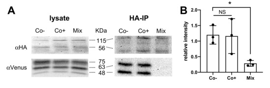 To confirm the physical interaction between H4R and TSPAN4, HEK293T cells were transfected with HA-H4R and mVenus-TSPAN4, and cell lysates were subjected to immunoprecipitation using an anti-HA agarose beads. Both lysates and immunoprecipitates were resolved by SDS-PAGE and subsequently immunoblotted using rat anti-HA and goat anti-mVenus antibodies. To verify that co-immunoprecipitated H4R-TSPAN4 complexes are not the consequence of non-specific aggregation during the cell solubilization procedure, cells transfected with either HA-H4R or mVenus-TSPAN4 were mixed prior to the solubilization step. HA-H4R and mVenus-TSPAN4 were detected in immunoblots of both co-expressing (Co-) and mixed (Mix) cells (Figure 5A left panel), whereas mVenus-TSPAN4 was only detected in co-expressing cells (Co-) upon immunoprecipitation of HA-H4R confirming their physical interaction (Figure 5A right panel). Stimulation of these co-expressing cells (Co+) with 10 µM histamine did not seem to affect the co-immunoprecipitation of TSPAN4 with H4R (Figure 5A,B), which is in line with the only small decrease of basal BRET and MYTH.
