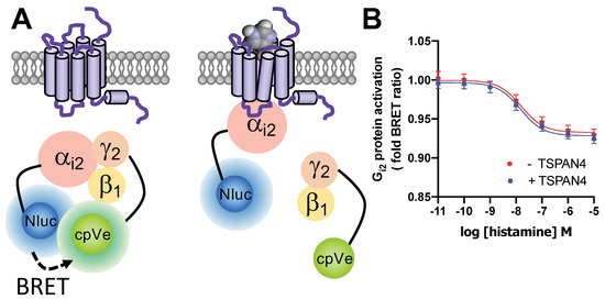 Co-expression of TSPAN4 did also not affect H4R-mediated heterotrimeric Gαi2 protein activation in response to histamine (pEC50 = 7.8 ± 0.13) as compared to cells expressing only H4R (pEC50 = 7.8 ± 0.03) as detected by BRET-based G protein activation sensor (Figure 6A,B).