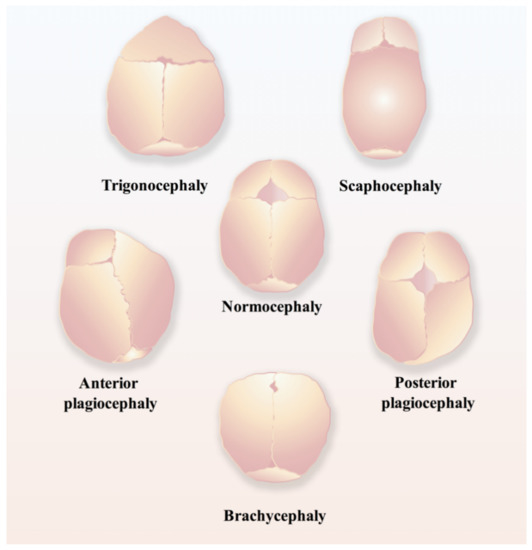 Regarding the time points of normal closure of cranial sutures, in humans, the frontal suture usually undergoes fusion within three to nine months after birth, while other cranial sutures will stay patent until adulthood [17]; in mice, the posterior part of the frontal suture will be fused by endochondral ossification within one month postnatally, while the anterior part of the frontal suture and other cranial sutures never fuse and remain patent throughout life [18,19]. Craniosynostosis (Figure 2), the premature fusion of the cranial suture, will hamper the normal development of the brain and often leads to the impairment of cognitive functions, sometimes even intellectual disabilities, due to increased intracranial pressure [16,20,21,22]. Currently, the only applicable therapeutic option for craniosynostosis is complex surgery, for instance, spring-mediated cranioplasty and minimally invasive strip craniectomy partial craniectomy followed by cranial molding orthosis (helmet) therapy, to correct the deformity and prevent its devastating sequelae [23,24], which are most likely to occur if appropriate surgical intervention is not conducted in time [24].