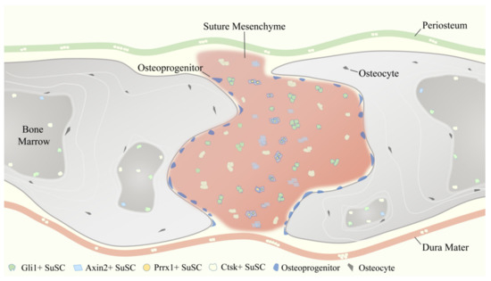 Suture mesenchymal stem cells (SuSCs), a heterogeneous stem cell population, belong to mesenchymal stem cells (MSCs) or skeletal stem cells (SSCs), with the ability to self-renew and undergo multi-lineage differentiation. So far, research on MSCs or SSCs has been majorly conducted and focused on the long bone. In the field of cranial bone research, relevant studies are quite limited. Therefore, it is not until recent years that the stem cell population of the cranial region has ultimately been identified and isolated with several markers [1,2,3,4]. Studies have revealed that, unlike the well-established perivascular niche of SSCs in the long bone [5,6,7], stem cells of the cranial bone are generally located and confined within the cranial suture mesenchyme, subsequently defined as SuSCs [2]. To date, there are only four markers, to the best of our knowledge, that have been verified to be labelled SuSCs, including Gli1 [1], Axin2 [2], Prrx1 [3], and Ctsk [4]. Moreover, these four SuSCs subsets certainly share some common properties, whereas they are still mutually distinguished.